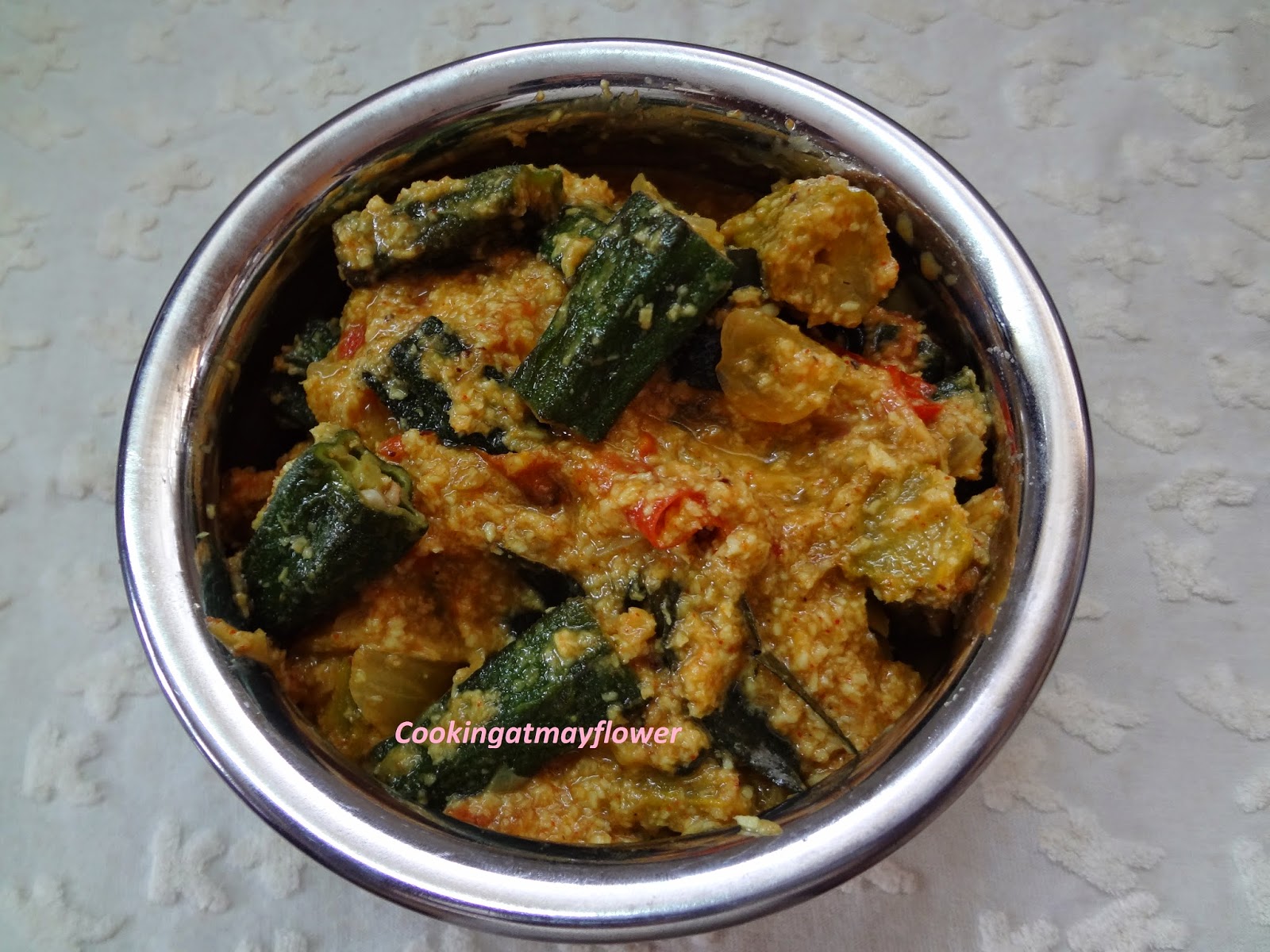 In a kadai with water, cook drumstick, onion, tomato, green chillies, chilli powder, coriander powder, turmeric powder and salt. When it is almost cooked, add ground paste and sauteed ladies finger. Cook for 5 minutes in low flame. When water is about to dry up, add coconut oil and curry leaves.